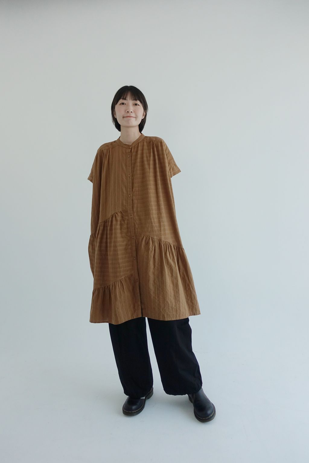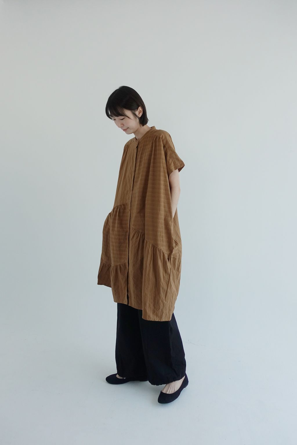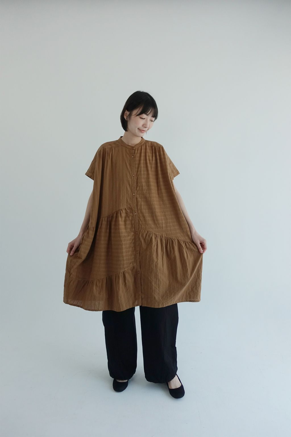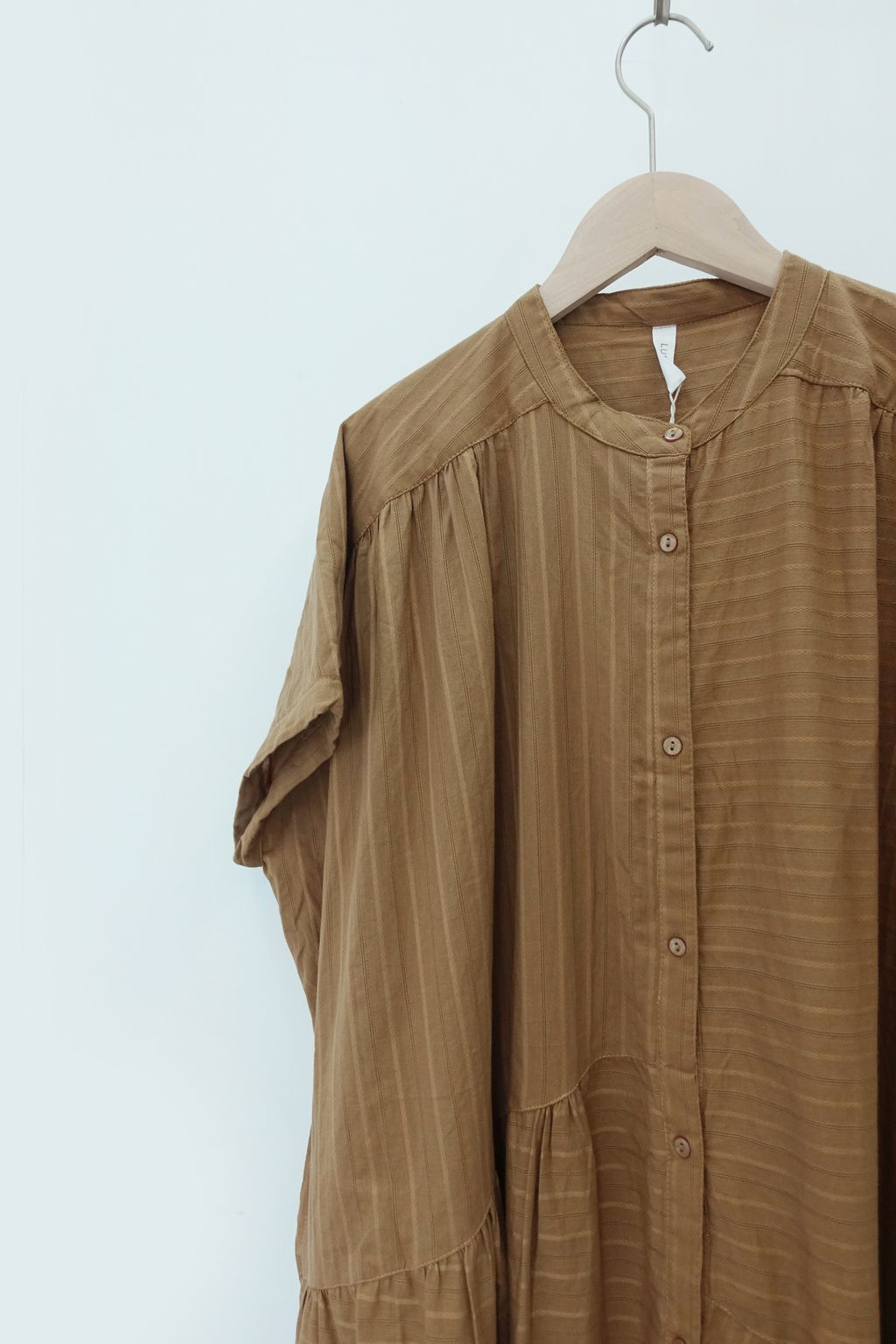 • 衣身以多片剪接線構成層次拼接,細緻抽褶營造份量與立體線條